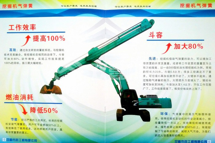 環(huán)保:氣彈簧中的高壓氣體循環(huán)使用,使得挖掘機(jī)發(fā)動機(jī)的作業(yè)功率減小,排放量降低一半以上,有效降低機(jī)械使用成本。綠色能源讓油耗降低50%以上,有效控制了污染物的排放,減輕大氣污染,為我們的后人創(chuàng)造美好的明天。