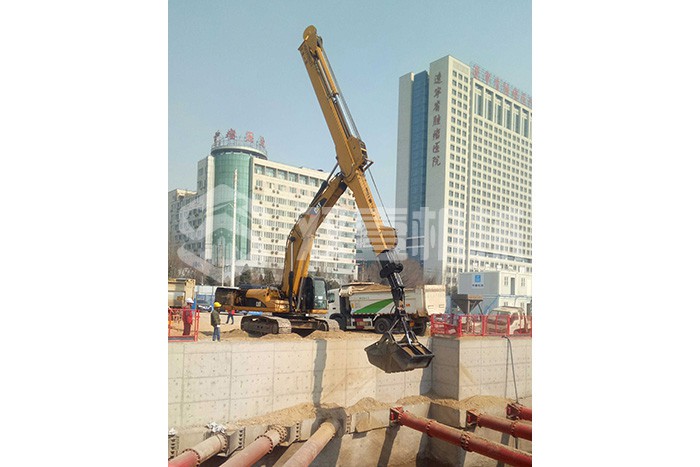 超長四節臂:總長度可達48米,臂內可再伸出3節,施工深度42.5米,配帶貝殼斗1.8立方或挖掘斗1.0立方。
